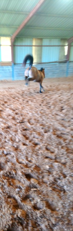 Nous commençons notre séance de longe . Au pas il n'avance pas tip top je suis obligée de le solliciter alors qu'en temps normal pas besoin . Le passage au trot qui d'habitude et toujours quasiment parfait est comme nos 2 dernières séances