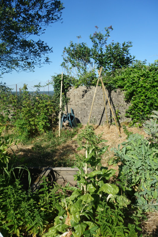 Ici vous voyez le tiipi pour les concombres fraîchement plantés, le chou Daubenton, les blettes qui montent en graines (je vais attendre qu'elles soient prêtes et les garder pour en semer l'an prochain !), de la menthe. Sur le mur, quelques ronces, et surtout un chèvrefeuille.