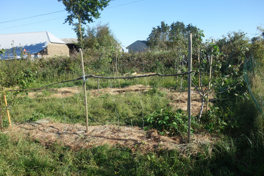 Et ici, une partie du "U" qui accueille les courges cette année, avec des pruniers dans chaque angle (pruniers qui ont 3 ans cette année, j'espère qu'ils donneront bientôt !) ; j'ai donc installé un grillage pour les haricots à rame que j'ai semé ce matin. On peut voir un plant de potimarron (ou butternut ? mélangés...)sur le côté. Les autres sont trop petits, mais poussent tranquillement le long de ma structure. Je vous ferais des photos lorsqu'ils seront plus gros :)