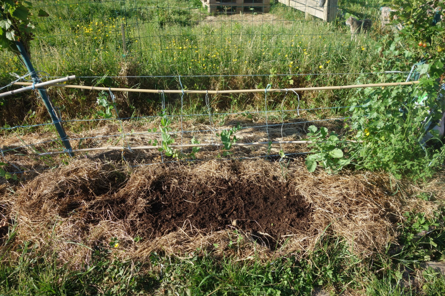 On ne voit pas en photos, mais il y a également des courgettes, un espace que j'ai récupéré cette année, où j'ai juste semé des engrais verts, et mon espace à aromates, radis, laitues et betteraves (qui ont été très peu nombreuses à lever).