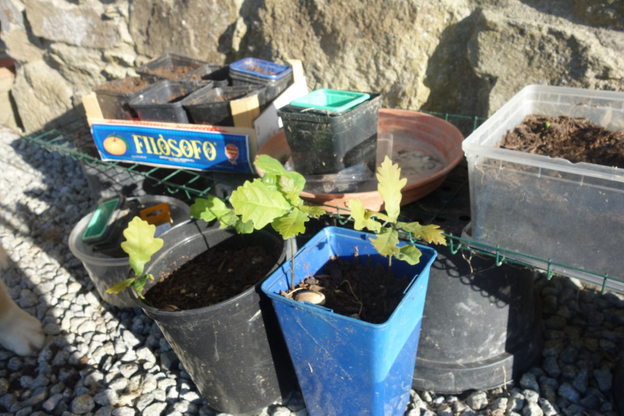 Détour par la pépinière où 4 petits chênes ont poussé ! On les plantera à l'automne, à la suite d'autres boutures ou semis sauvage, et ce dans le but d'augmenter le nombre de haies (et de diminuer le vent !)