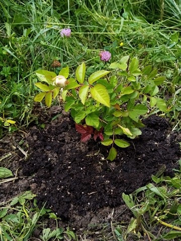 Il y avait un rosier aussi dans la composition florale. Bon, on ne connait pas la couleur mais je dirais du blanc au vu du bouton !