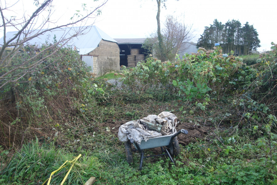 Le chargement de la brouette, ce sont les restes de bâches de l'ancien proprio... On est pas au bout de nos surprises, on a également trouvé des fers à béton, des piquets à vaches, du fil galva et du barbelé, tout ça pris dans les ronces et/ou sous terre...