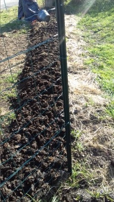 Chéri a bécher de nouveau son côté du grillage (côté gauche). Il considère indispensable de défoncer toutes les mottes de fumier, de tout casser et tout retourner. Selon lui c'est absolument indispensable et il compte faire ça jusqu'en Mai, moi de semi pour ses fleurs...