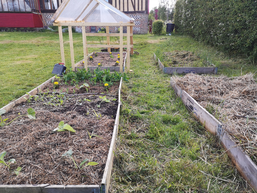 Et du coup sur ce qu'il reste j'ai: blettes (ça aussi on est en autonomie et ça se resème seul d'année en année), fèves, un peu de petit pois mais ça a du mal, topinambours, ail, oignon, diverses salades, tomates, un pied de courge mystère, 2 courgettes, 1 patisson, radis, carottes, orties, menthe de différentes sortes sortes, pleins d'aromatiques, 2 poivrons, 3 aubergines, du céleri branche, des fleurs diverses et comestibles et des pommes de terre. Je crois que je n'ai rien oublié. Je me tâte à trouver de la place pour des haricots haha.