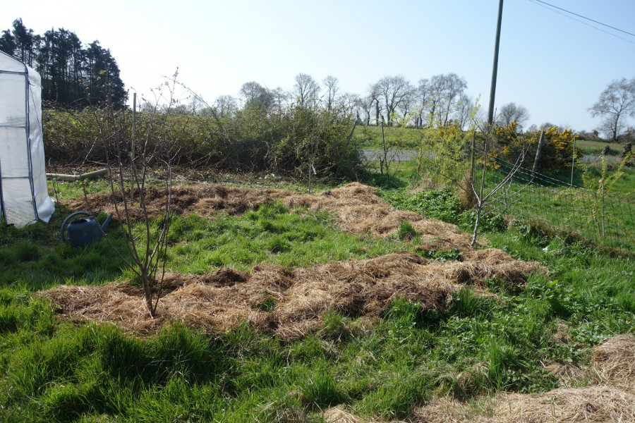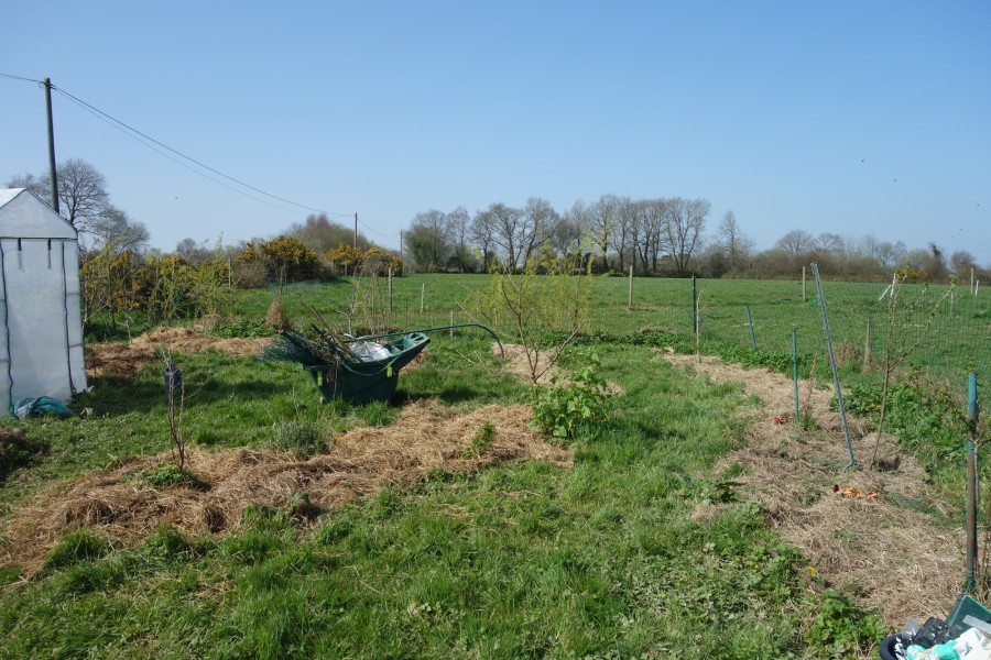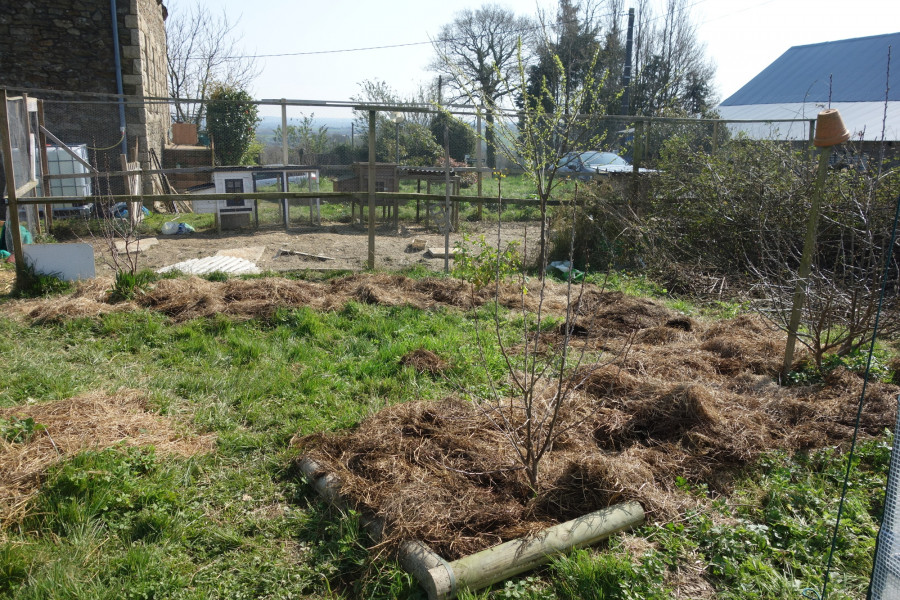 Le U des pommiers/poiriers, où pousseront tomates, aromates, et il y a aussi es fraisiers aux pieds des arbustes