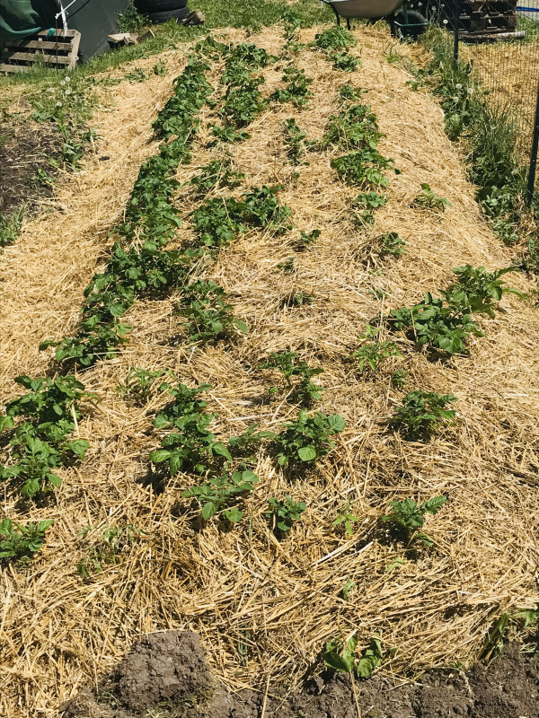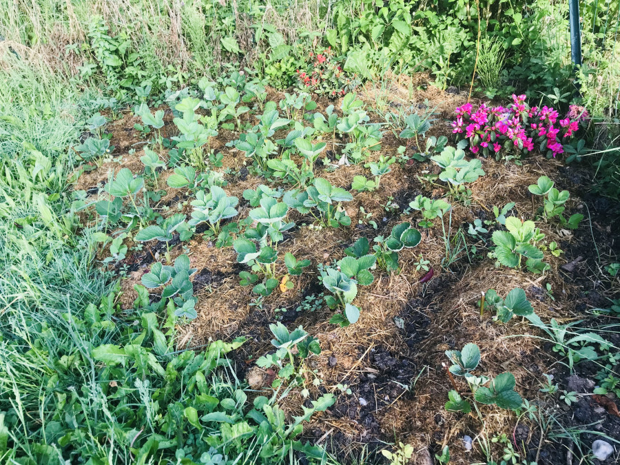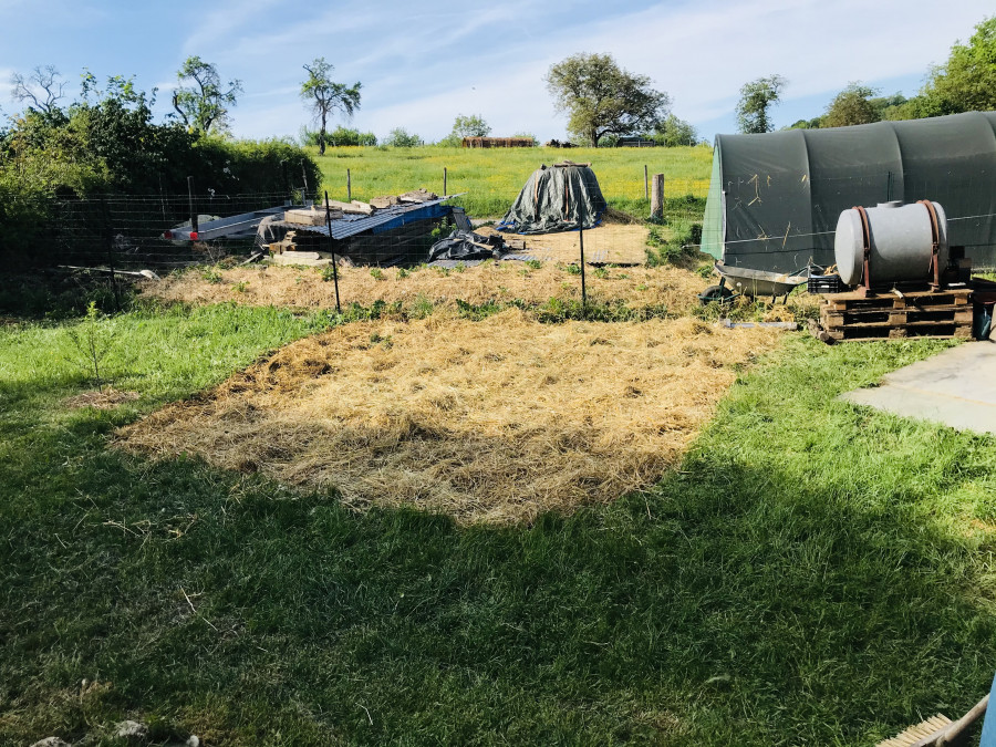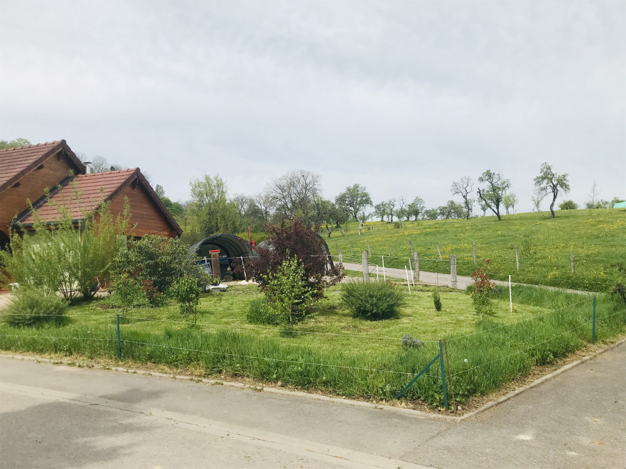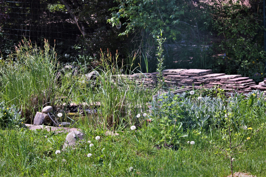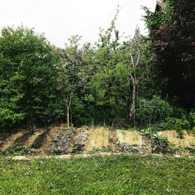 Et sur le terrain clôturé avec les deux potagers on a une mare de 3m3, un mini point d’eau, des tulipes, une zone typée sous-bois, un bouleau (encore), le prunus de 9m, de la citronnelle, des azalées, quelques petits sapins, une glycine encore bien petite.