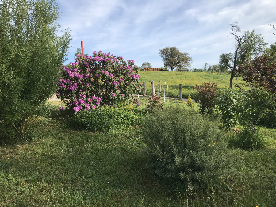 Ici, on a fait une haie fruitière (framboises cassis myrtilles groseilles...) , on a un espace uniquement dédié aux arbres et arbustes (saules blancs, saules Marceau, bouleaux, lavande, fotynias, forthysias, rhododendron, noisetier, pommier d’ornement, mûrier d’ornement, lilas, fusain, mirabellier, cerisier, Prunier, de la jachère pour les bordures de route (impossible de planter on a la route sous 5cm de terre...) dans ce même espace arboré on a un mini point d’eau au sol.