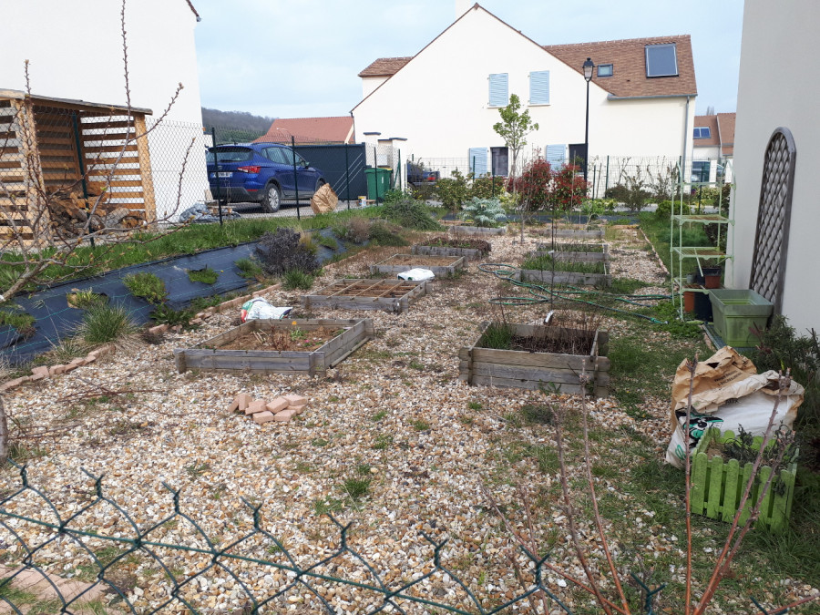Avec plusieurs arbres fruitiers (abricotier, pommier, poirier, cerisier, mirabeilliers, groseillers, framboisiers) et herbes aromatiques (thym, thym citron, romarin...) et pour le reste des carrés, il faut que je replante mais mes semis n'ont pas pris (graines trop vieilles je pense) donc j'ai recommandé des graines.