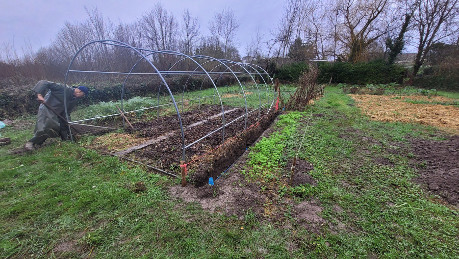 Ici la serre dont on va changer la bâche, mon père s'affaire à creuser la tranchée pour y enterrer la bâche...
