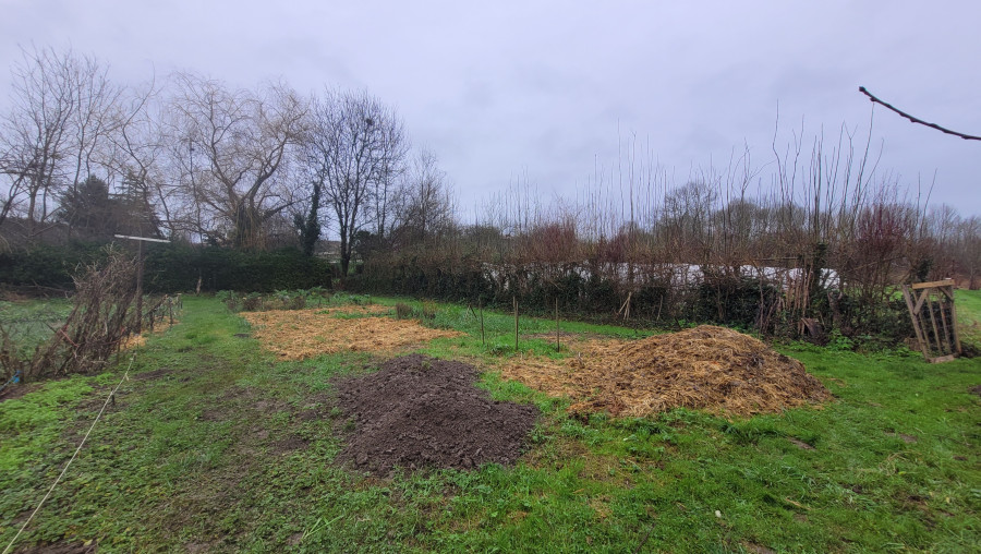On poursuit la douce reprise du jardinage : j'ai récupéré aux écuries un mélange crottins/copeaux que j'ai mis au potager : une partie sous la serre et l'autre dans le rang d'asperges (c'est un peu prétentieux de l'appeler "rang" vu son peu de rendement....