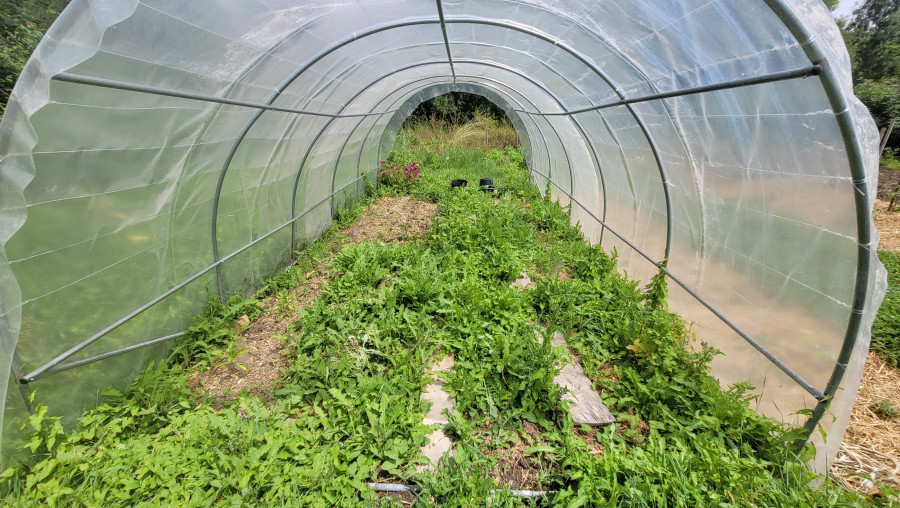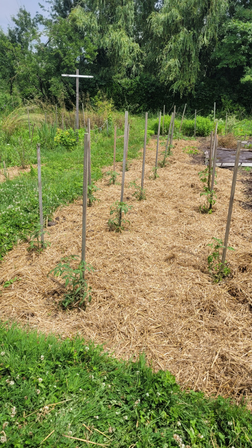 Une fois toutes les deux semaines on fauche un petit carré d'herbes pour déplacer le poulailler, et on se sert du foin créé pour pailler le potager, que je n'arrose pas du tout.