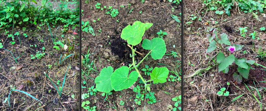 Les pousses poireaux qu'on m'a offertes semblent se plaire aussi même si ce n'était pas prévu, mon pied de potiron est en forme, et mon pied de patates douce a une fleure !