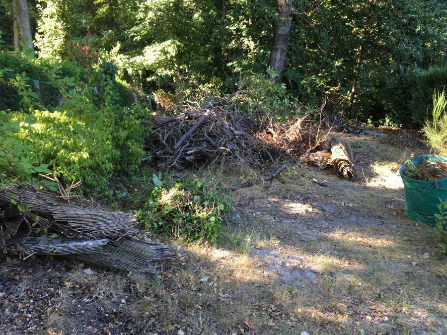 On a coupé les haies, nettoyé toutes les clotures prises dans le lierres, arracher les mauvaises herbes (ronces, orties entre autre), fait le trie entre le bois récupérable et les branchage inutilisable