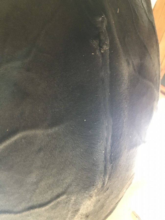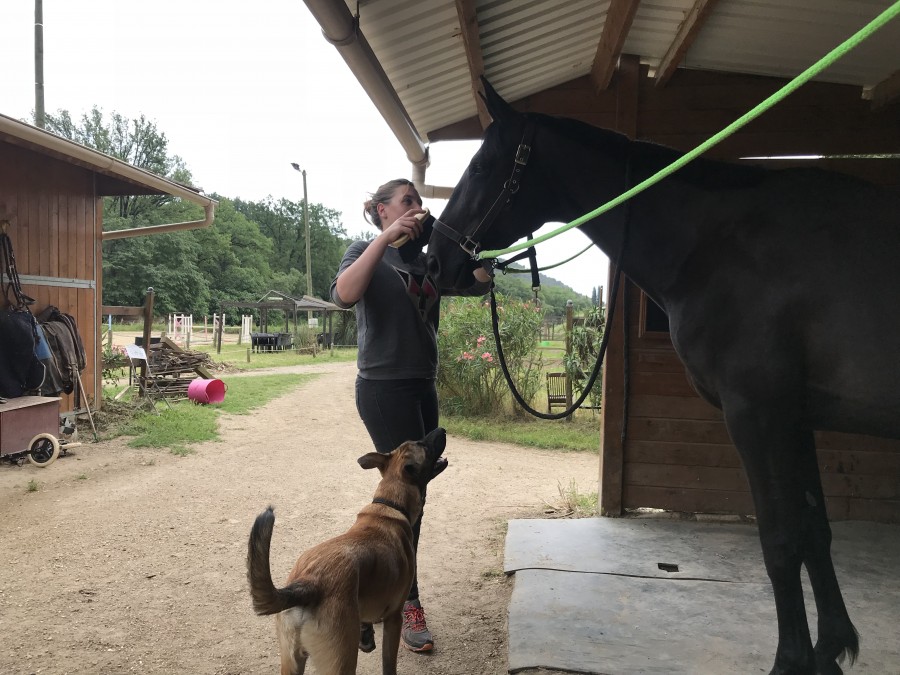 On embarque donc la jument, on enlève le licol au cas où elle tomberait. Arrivée sur place la véto s’occupe vite d’elle : sédation et fouille. C’est un déplacement du colon, heureusement qu’on est venues tout de suite. La jument commence à gonfler. Elle l’a perfusée et lui a passé de la paraffine. Ensuite je l’ai longée au trot mais aucun gaz n’est sorti.