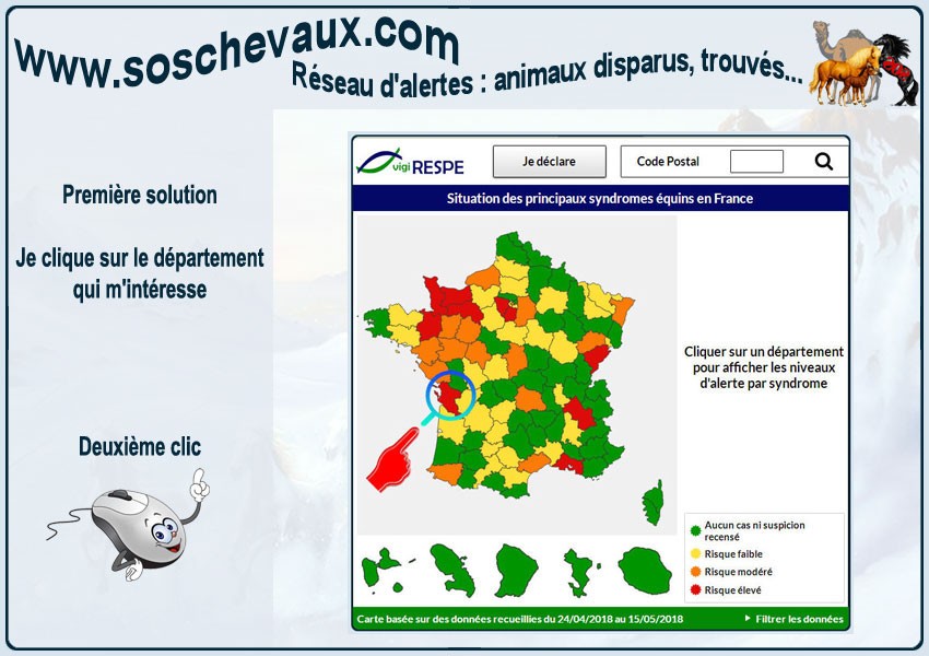- Alerte rouge (carte en date du 10/05/2018) - HVE1 et HVE4 = Rhinopneumonie - et - Gourme