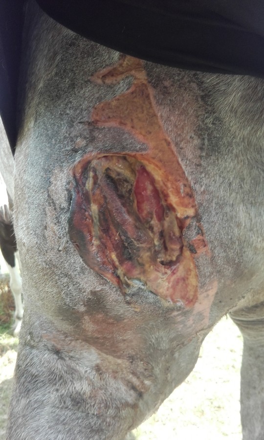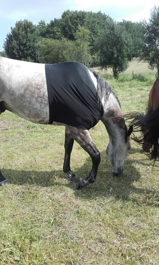 j'ai déjà eu à faire à des plaies comme ça, au même endroit et à la même saison (dont une fois sur un poulain pas trop coopératif...), et c'était "juste" dû à des coups de pieds dans le poitrail, jamais emballé le truc, par contre cothivet à outrance, en + de l'effet non négligeable de cicatrisation, ça repousse bien les insectes...