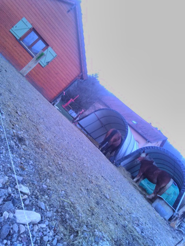 Du coup aujourd'hui comme tous les samedi c'était retirer les crottins. Mais j'ai fait mieux. J'ai mis l'eau, cassé la glace, idem dans le paddock en herbe, j'ai mis du foin et je les ai lâchées là bas. Ensuite j'ai rabaissé les deux abris d'eau moins 8cm (donc sur 42m carré ça fait de la matière) en plus du tas de crottin de la semaine
