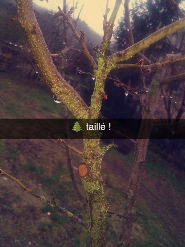 J'ai aussi entretenu mon fruité qui a deux ans et qui faisait déjà pas loin de quatre mètres. On l'a taillé un peu, on lui a retiré tous ses vilains rejets (merci les juments de manger mon arbre !) Bref il sera BEAUCOUP MIEUX comme ça !