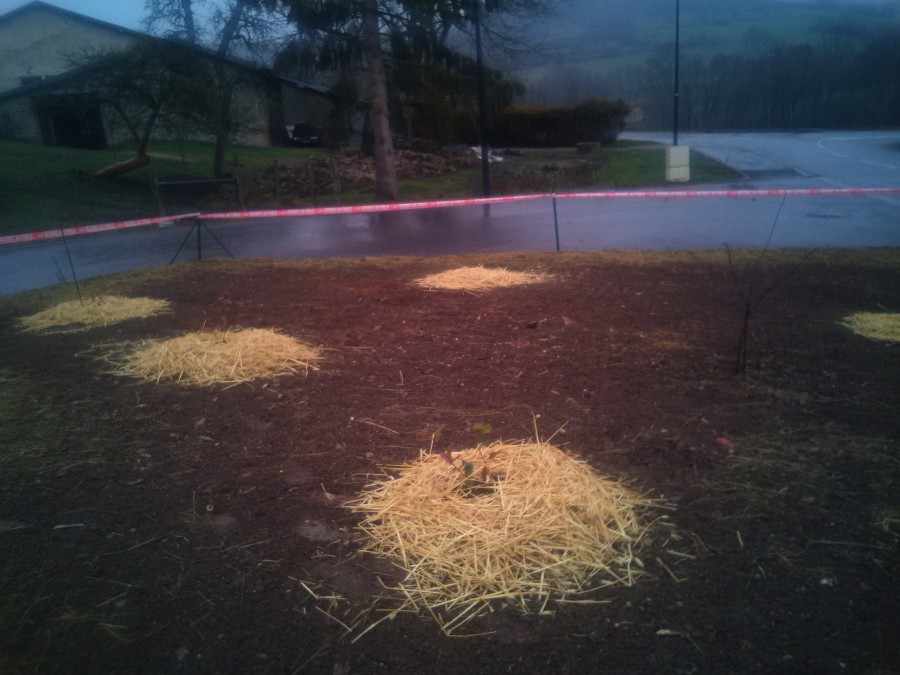 Doucement mais sûrement je prépare le petit bout de terrain devant le paddock. Chemin de paille en attendant (système D oblige...), j'ai remis du terreau autour et sous les arbres, ai arrosé malgré la pluie et la neige et j'ai couvert avec de la paille pour les protéger ! (Sauf l'acacia mais c'est tellement gras le terrain qu'il attendra !).