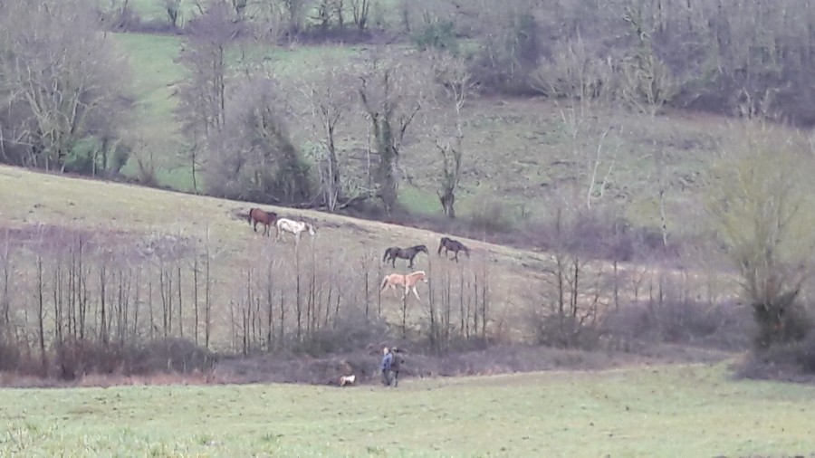 Ici ça va. Elle est toujours copine avec la jeunette du pré. Ça fait grooming galops et siestes. J'ai pu monter 2 fois. La première je me suis fait trainer... trop de stress. Mais je l'ai eu pire alors je note le progrès malgré la nouveauté. Un cheval en main qui passe au bord... élément déclencheur à la bêtise... genre elle en a jamais vu...