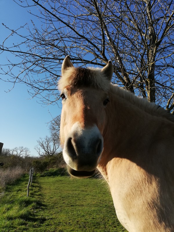 Il y a 5 ans, lorsque mes parents ont acheté leur maison de campagne en Bretagne. Nous y venions pendant les vacances scolaires et certains week-end, et au fil du temps, je me suis rendue compte que notre voisin possédait deux chevaux Fjord, la maman et son fils. Évidemment, je n'ai pas pu m’empêcher d'aller faire un coucou à ces loulous, et voir s'ils venaient vers moi. Il s'est avéré qu'ils étaient très proche de l'homme et curieux, et donc à chaque promenade devant leur champs, ils avaient droit à un petite caresse...