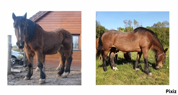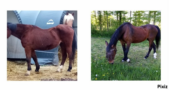 3 semaines de douleur et d'attente !!!! Voilà d'où l'on part alors. Que faire ? Le foin oui, elle finit par le remanger, mais moins bien, clairement. Alors je fais appel a une nutritionniste. J'impose le sans-céréale et pas de sac déjà tout prêt. Alors, nous mettons en place une complémentation adaptée, calculée. Et oui, le sans céréale, avec CMV et foin à volonté, ça fonctionne. Nous partons donc sur 8 mois de rééquilibrage alimentaire pour une prise de poids optimale. En trois mois, déjà, la jument est presque métamorphosée !