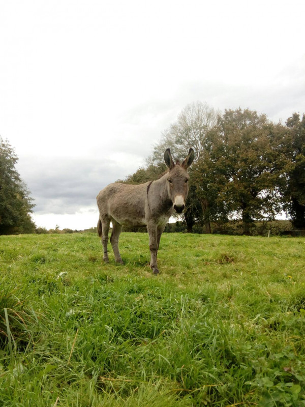 Filou, est un jeune âne typé Cotentin de 5 ans. Je l'ai d'abord accueilli en pensant le valoriser à l'attelage et à la traction animale pour le revendre, mais j'ai de plus en plus envie de le garder...