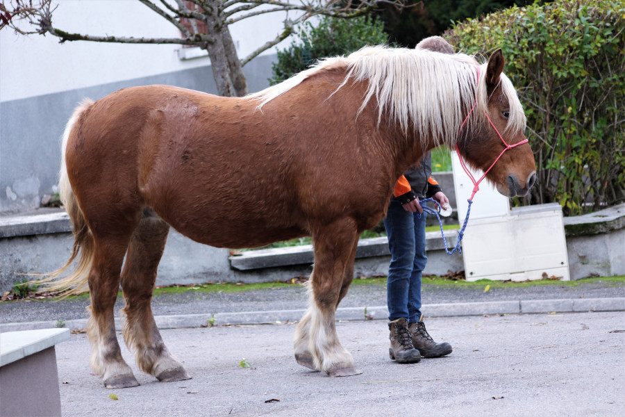 Donc dès le départ, dès le pansage, je lui ai expliqué le handicap de la jument et ce qu'il fallait donc faire (parler, la toucher avec un contact léger mais constant, bien respirer, se détendre...) et on a abordé les notions théoriques de la communication non verbal, du renforcement positif et négatif, de ce que ça implique (dans les grandes lignes)...