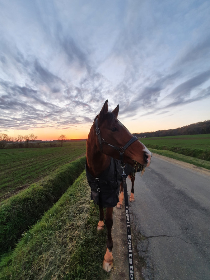 Je ne suis pas allée loin (1km aller, 1km retour), sur le chemin qui monte au dessus de la maison. Cliker en main, stick, longe autour de l'encolure, granulés de foin dans la poche et en avant. Bah franchement, c'est une belle victoire !