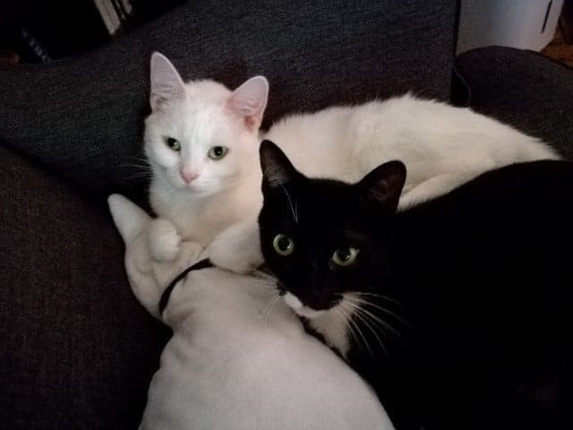 tartine88 Mookie, mâle noir et blanc de 4 ans, et Peebee, femelle tricolore de 1 an et demi. Parfois c'est la guerre, parfois c'est les câlins. On les surnomme le syndicat du crime