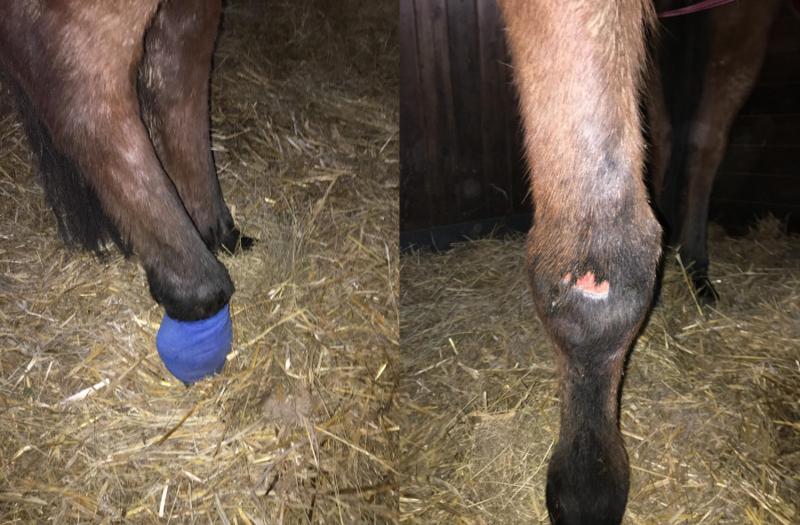 Le vétérinaire est arrivé peu de temps après, contacté par la gérante pendant qu'on récupérait Vainqueur. Il l'a examiné et a soigne sa plaie au PD. Il s'est bien ouvert, surement avec le barbelé en sautant la clôture. Il s'en sort donc avec un box ferme jusqu'à cicatrisation de la plaie, nettoyage et pansement tous les jours pour garder la plaie propre et éviter une inflammation, surtout qu'on est très proche de l'articulation. Antibiotiques, anti inflammatoires et surement pas mal de courbatures dans les jours à venir.