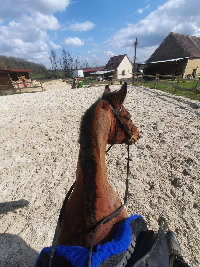 Donc bon il est monté lundi pas mon veto et s’il ne boîte pas (on a fait 40min de marche en longeant un pré avec des poneys et il n’a fait que piaffer