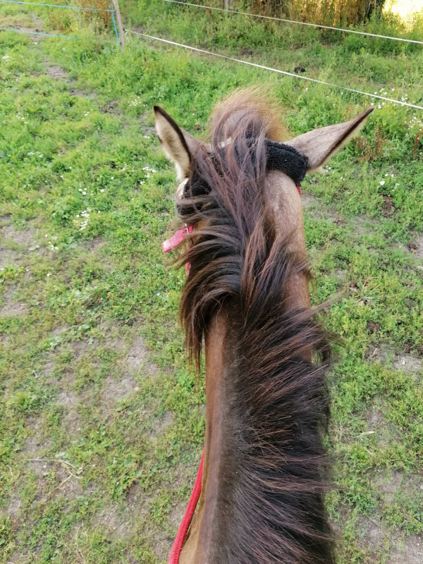 Dimanche, je me suis donc retrouvée à mettre pas loin d'une demi heure pour sortir du manège (après une séance de 30mn montée, c'est beaucoup de temps avec la selle sur le dos pour rien eheh). Le cheval qui veut pas rentrer dans le manège, je connais. Le cheval qui se décale, bouge, refuse de rester arrêter au montoir, aussi. Pas de soucis avec Pastor de ce côté là. Par contre, une fois descendue... Il voulait plus bouger ??? Je le laisse toujours marcher un moment rênes longues à la fin de ma séance évidemment, je m'arrête tranquillement au milieu (toujours rênes longues), je descends, je désangle un peu puis je fais quelques gratouilles. Enfin, "on rentre". Sauf que dimanche, ben il a juste pas voulu me suivre. Il était planté là, l'encolure à l'horizontale, les oreilles bien pointées et il me regardait comme si il était complètement bugué. J'ai essayé de l'encourager à me suivre, rênes en main, rien du tout. Finalement, je lui ai mis les rênes en "sécurité" (il a déjà marché dessus et m'a cassé une paire en se mettant un bon coup dans la bouche au passage, donc je me méfie maintenant) et je l'ai laissé en liberté. Il avait vraiment l'air tracassé par un truc et à force d'encouragement à la voix, revenir vers lui faire quelques gratouilles, me ré-éloigner de quelques mètres, j'ai réussi à le faire venir jusqu'à... 5m de la porte ? Et là il s'est mis à reculer.