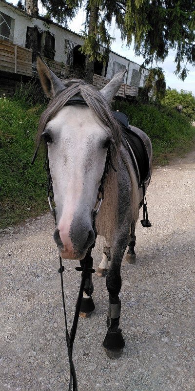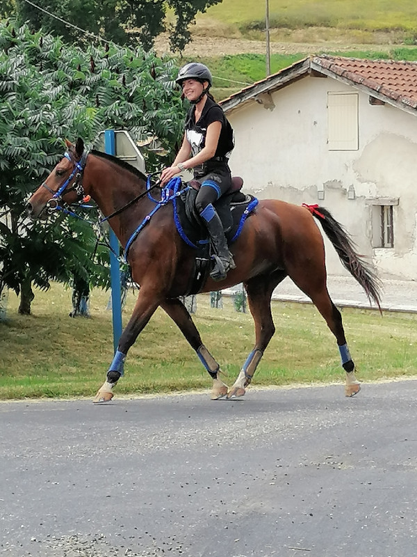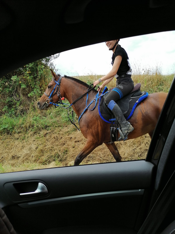 ? Quand on était juste à pieds ou en liberté, je sors peut-être différemment... quoique toujours en venant face à la porte de toute façon, je fais jamais un tour complet avant de sortir. La seule différence, c'est que si je reste en liberté, je referme la porte et je le lâche à la porte, alors que si je monte, je laisse la porte ouverte (il a l'air de préférer pouvoir voir ce qui se passe dehors quand un truc le tracasse) et je fais un tour complet de la piste à pieds (en partant vers C) avant d'aller ressangler / rejoindre le montoir, mais je vois pas trop en quoi ça pourrait jouer ?