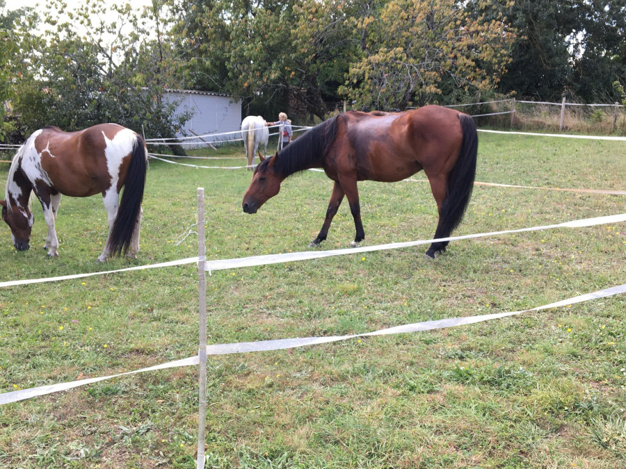 Ensuite pause chez une fille des écuries. Des paddocks avaient été aménagés dans son jardin pour l'occasion. Vainqueur était avec 3 autres hongres : son copain de pré et 2 autres. Il n'a pas arrêté de chasser les 2 autres dès qu'ils s'approchaient de SON copain... comment bien se faire remarquer ! Après une (longue) pause barbecue, on est reparties pour une boucle d'une petite dizaine de kilomètres avant de rentrer.