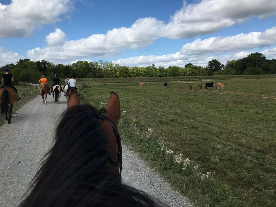 Dimanche c'était la rando ! On était un groupe de 8 chevaux. 2h15 le matin pour environ 15 km. Un peu de dénivelé au départ puis c'était plus plat. On a pu faire quelques beaux galops ! Vainqueur se disputait la tête avec un petit cheval d'endurance.. ça rigolait pas