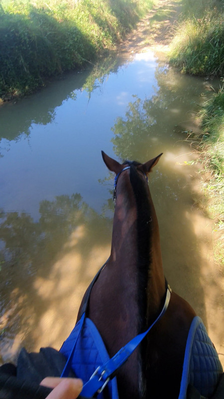 Vainqueur n`a pas trop de réflexe " demi tour " mais il a eu une période où il se mettait à reculer fort sans rien écouter à l`approche des passages d`eau. Donc là j`avais prévu un petit stick pour m`aider, si besoin, à stopper le mouvement vers l`arrière. Bien sûr, pas question de rentrer dans l`eau avec la pression du stick. Une fois arrêté, je le laissais regarder tranquillement et les premières fois je descendais carrément.. généralement si je suis au sol et que je passe, il a plus tendance à considérer que c`est ok (ou que je suis une folle inconsciente du danger..
