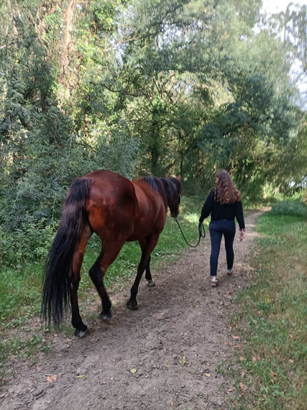 Remarque je rigole mais pendant le rdv, le véto m`a dit de faire marcher Vainqueur le temps que le produit anesthésiant agisse. Je suis partie dans le manège car il commençait à pleuvoir. C`était la première fois que Vainqueur allait dans le manège et il a tout de suite repéré le sol bien confortable ! Je le tenais court pour qu`il se concentre sur le mouvement en avant (puis la honte de se rouler en plein rdv véto