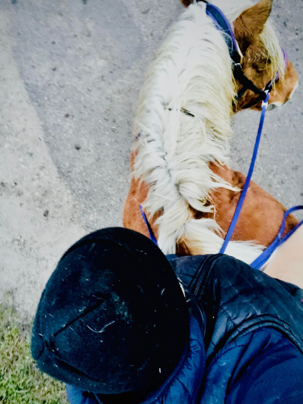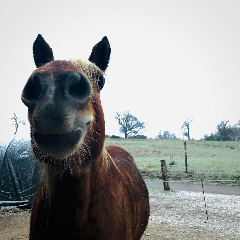 J'ai fini par faire un peu de travail au sol en liberté. Arrêt, trot, pas, décaler les hanches, DL par pression, puis par aspiration, reculer, immobilité. J'ai simulé un "retour en balade" en liberté, elle ne voulait clairement plus partir loin des copines malgré les granulés de foin dans ma main