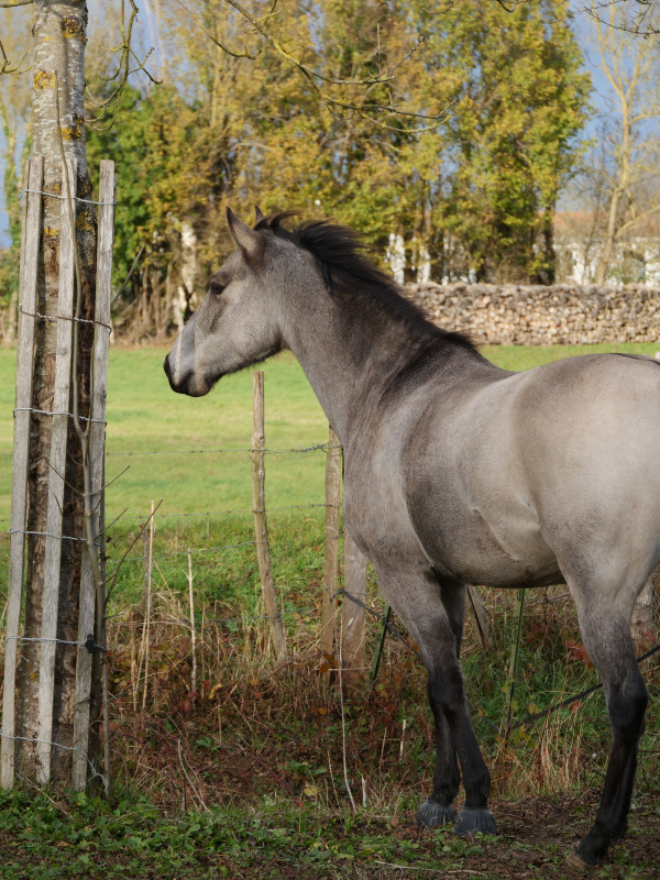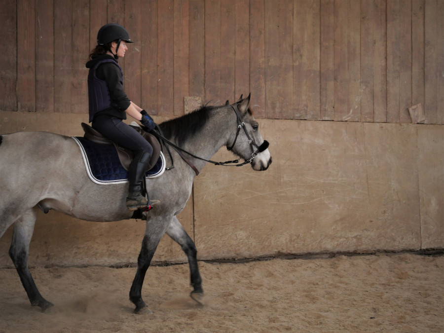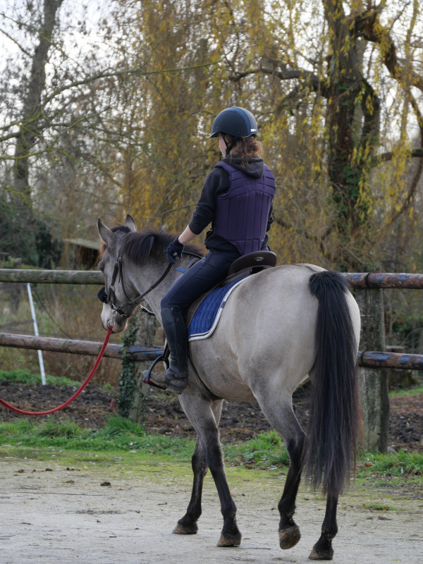 Je marche un peu aux deux mains et prends le trot assez rapidement, sur des rênes plutôt lâches. Vainqueur reprend ses vieux démons, à vouloir couper les cercles, se coucher et.. éviter une grosse flaque d'eau au fond de la carrière. Je remonte un peu sur mes rênes pour remettre du cadre au moins sur la direction puis retour au pas. Ensuite, on a retravaillé sur la mobilisation des épaules et des hanches. Mieux que la dernière fois, Vainqueur comprend le principe même si un peu froid à la jambe. Il s'améliore vraiment dans son attitude au pas, le contact aussi, je sens une discussion entre la main et la bouche.