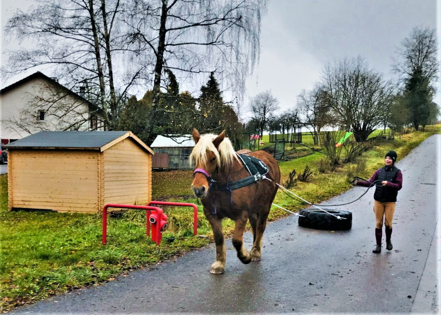 Du coup je me suis sentie obligée d'aller essayer. Cheval a eu besoin d'être élancée à l'épaule d'abord puis j'ai pu me reculer progressivement et on a finit par faire des allers-retours dans la rue, quelques virages dans le paddock en herbe.