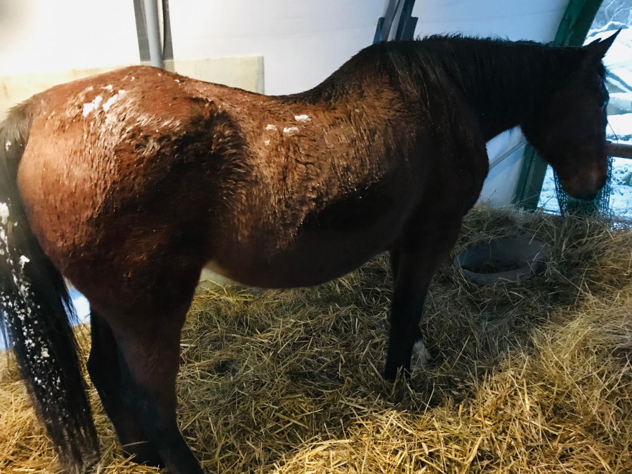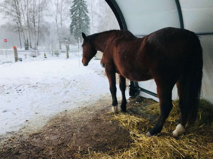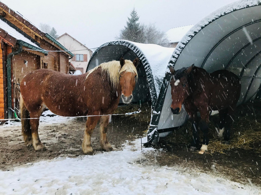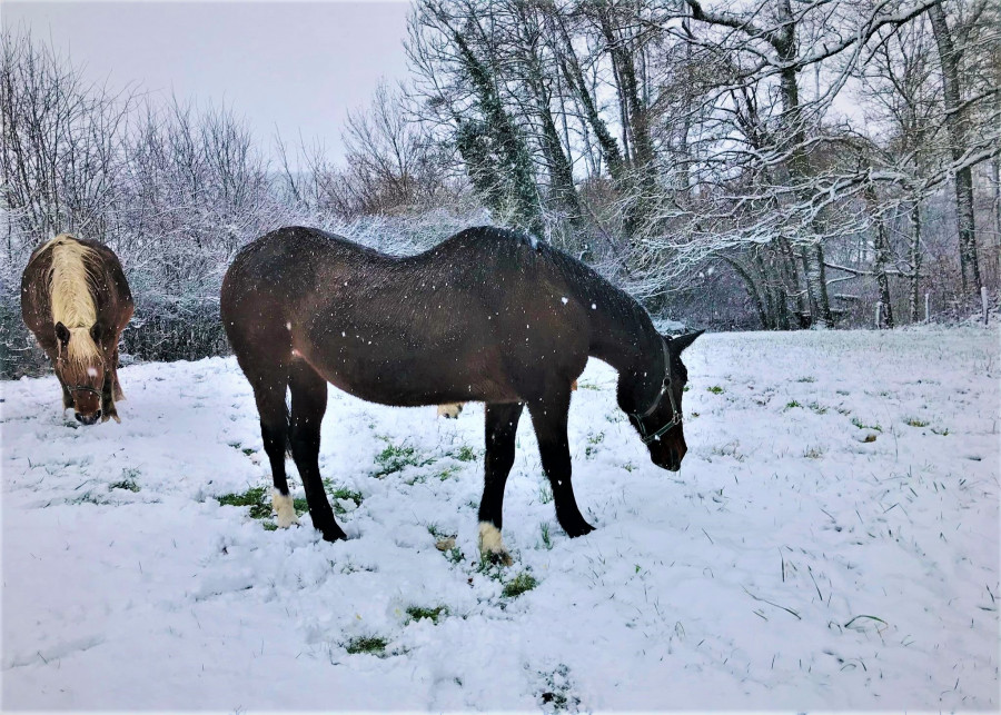 Elle a été couverte une nuit (22h30 - 7h00) parce que monsieur estimait que la jument aurait trop froid entre la pluie et le vent. Mais hormis cela, elle n'est plus couverte et très franchement elle le vit bien. Ce matin elle était sous le déluge de neige, j'étais en panique