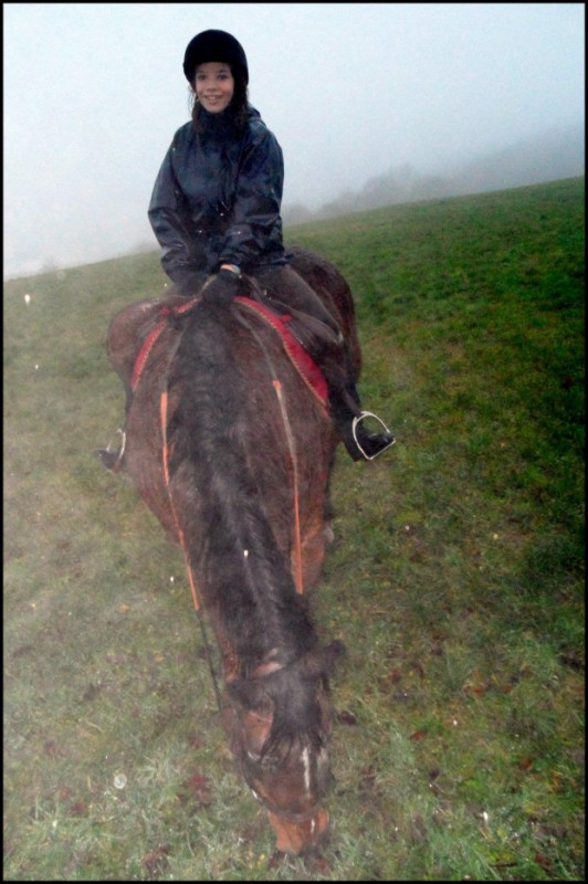 Si on parle du 7 Janvier 2012 avec Nina, c'était ... Sportif ! Galop1, pas fait de galop, jamais d'extérieur. Bref, on a fait les trois allures, en forêt, sur route, dans les champs et les chemins. Il pleuvait comme vache qui pisse, ça glissait, on avait du brouillard à crever... C'était scandaleux, mais la première et meilleure expérience de ma vie.