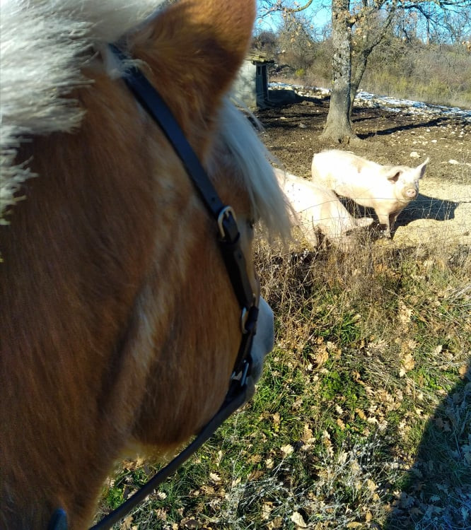 Randonnée de 20km aujourd'hui avec un ami ! On a vu des cochons !!! J'adore les cochons, si vous saviez, alors en croiser en route (fin grillagé !) rholala j'étais surexcitée ! Mon poney était un peu hésitant, puis il a voulu aller voir, ce gros courageux.