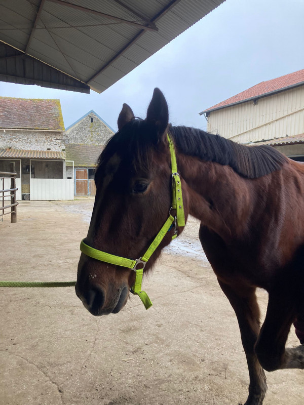 Dimanche je l'ai baladé en main et lâcher dans le rond de longe et hier je l'ai longé pour lui faire découvrir la carrière, il n'était pas du tout attentif mais pour sa défense entre la mini pelle en marche d'un côté et la gérante qui répare la barrière de l'autre