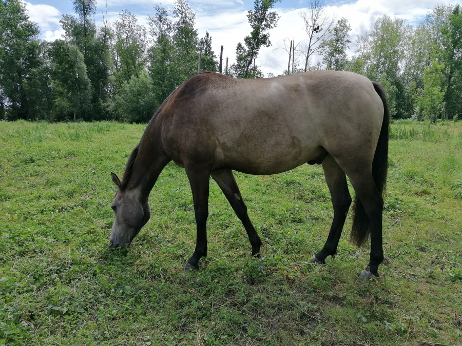 A chaque fois je divise en 3 parties. Broute puis travail du cadre pur sur le chassé des hanches. Re-broute puis longe en cercle (limitée au pas et un peu de trot juste pour avoir quelques extension d'encolure et deux-trois arrêts propres, là-dessus il est vraiment trop fort) re-broute et déplacements latéraux. Re-broute.