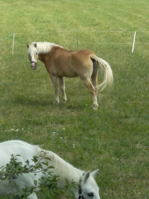 Il y a quelques jours je ressortais la selle pour Hocky et tentait de la poser sur son dos. Autant il n'a pas bougé les pieds, autant son expression faciale en disait long sur son mécontentement. J'ai donc enlevé le tout sans même sangler et j'ai laissé tomber, ce n'est pas le jour. Il n'était pas très disponible, ça a fini en liberté dans le rond à faire des jambettes et donner des bonbons, et manger de l'herbe dehors, c'était le seul truc "ok" pour lui ^^