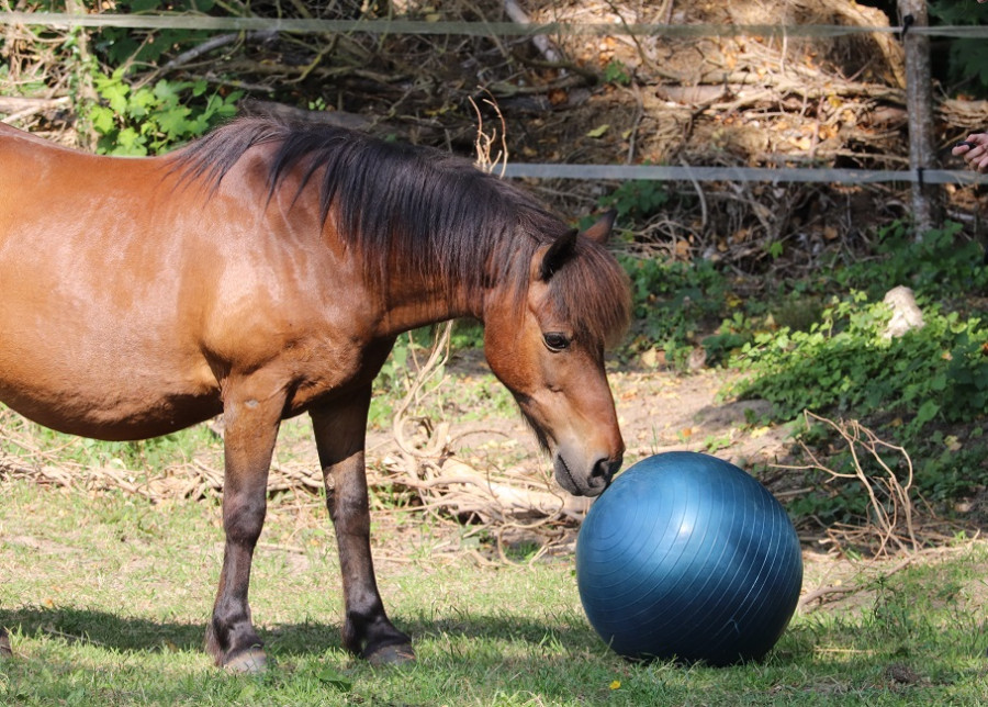 J'ai introduit le ballon avec lui aussi puisque je l'ai sorti avec Vainqueur et il est évidemment bien plus sur la réserve. On l'a fait une fois donc il se contente pour l'instant de le toucher du bout du nez.