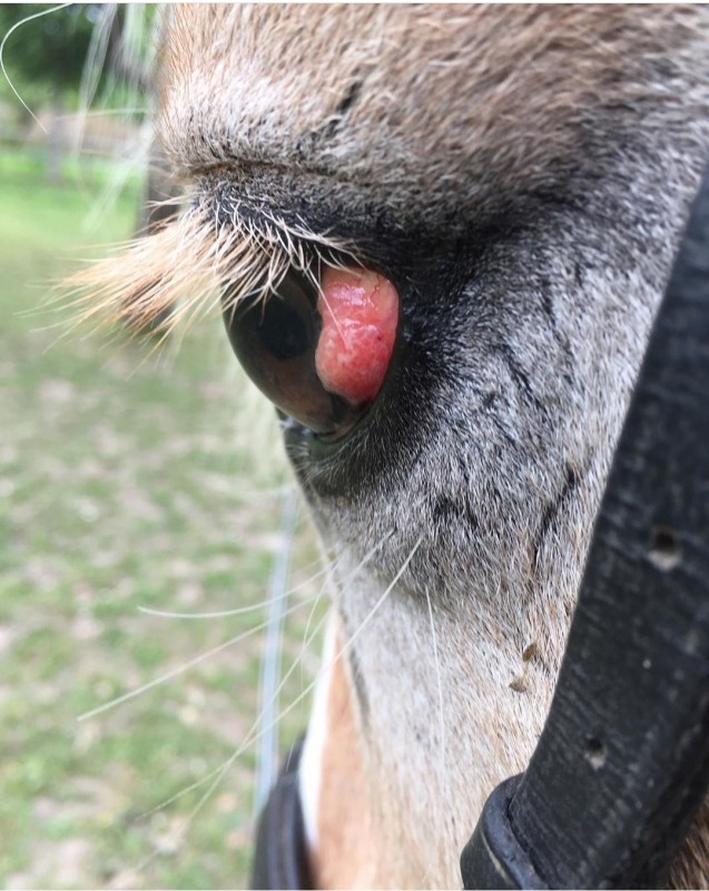 Suite à la découverte d'une masse suspecte sur l'œil de mon cheval, on vient de lui diagnostiquer un carcinome ( en haut, à droite ).